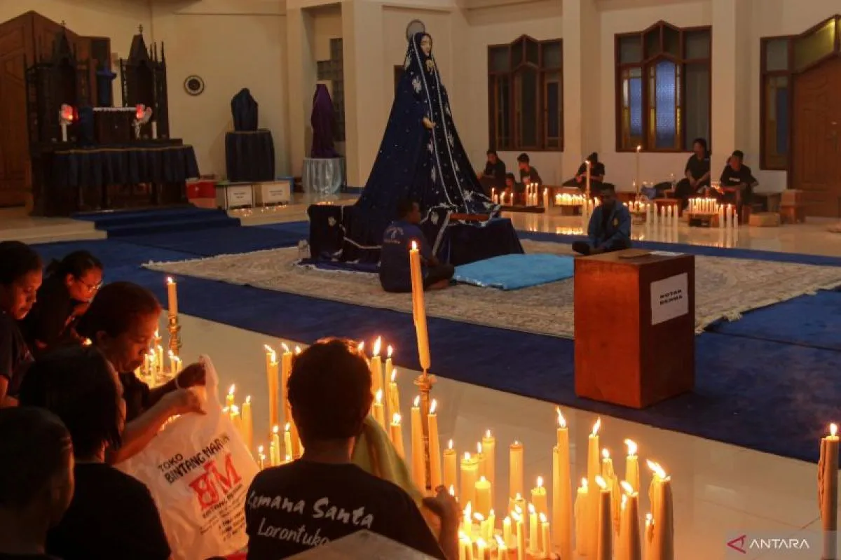 Peziarah dan Umat sedang berdoa di Kapela Tuan Ma, Larantuka, Flores Timur, NTT, Kamis (28/3/2024). Prosesi mencium Tuan Ana (Tuhan Yesus) dan Tuan Ma (Bunda Maria) merupakan salah satu rangkaian menuju Prosesi Jumat Agung yang akan dilaksanakan pada Jumat (29/3).