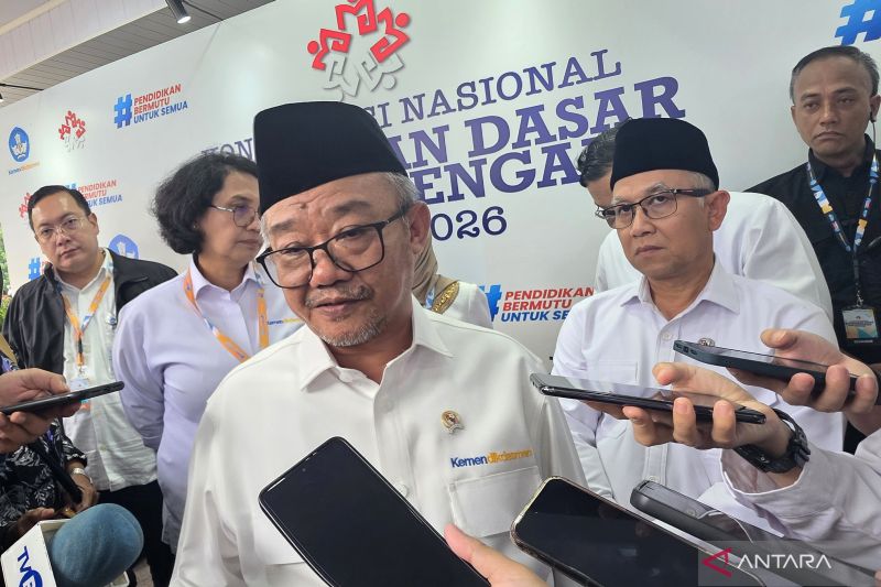 Menteri Pendidikan Dasar dan Menengah (Mendikdasmen) Abdul Mu'ti melakukan tanya jawab dengan media usai membuka kegiatan Konsolidasi Nasional Pendidikan Dasar dan Menengah 2026 di Gedung PPSDM Kemendikdasmen, Kota Depok, Provinsi Jawa Barat pada Senin (9/2/2026). ANTARA/Hana Dewi Kinarina Kaban