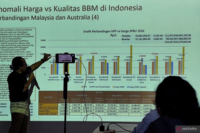 Perwakilan Komite Penghapusan Bensin Bertimbal (KPBB) memaparkan grafik perbandingan harga pokok penjualan (HPP) dan kualitas bahan bakar minyak (BBM) Indonesia dengan Malaysia. (ANTARA/HO)